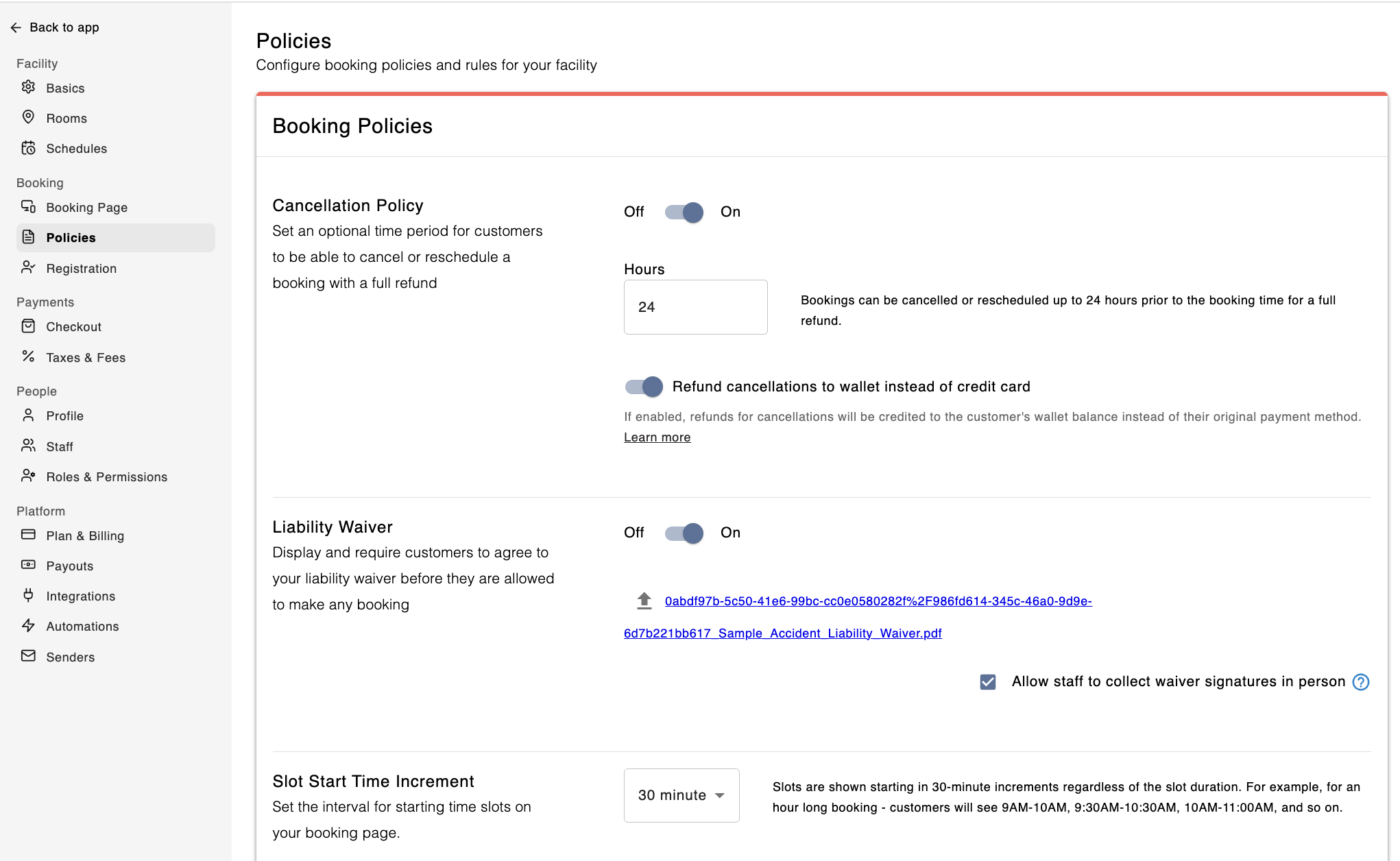 Liability Waiver: Upload your liability waiver so customers are required to sign & agree to it before making any bookings or purchases.
