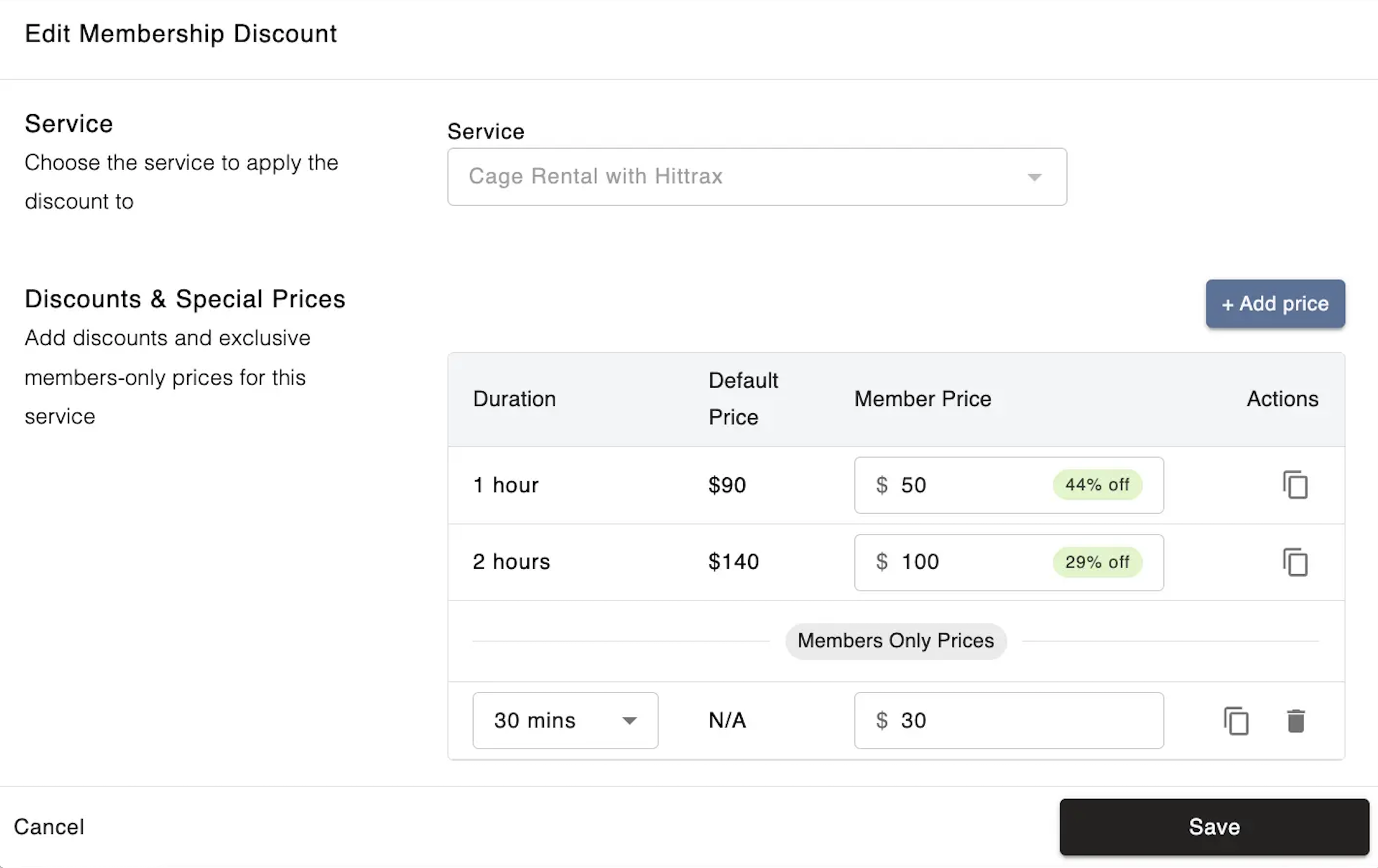 For the general public, a one-hour cage rental may cost $90, while members pay only $50. Swift automatically ensures that members see the correct price based on their account and membership. If a customer holds multiple memberships with overlapping discounts, Swift will always apply the lowest available rate.