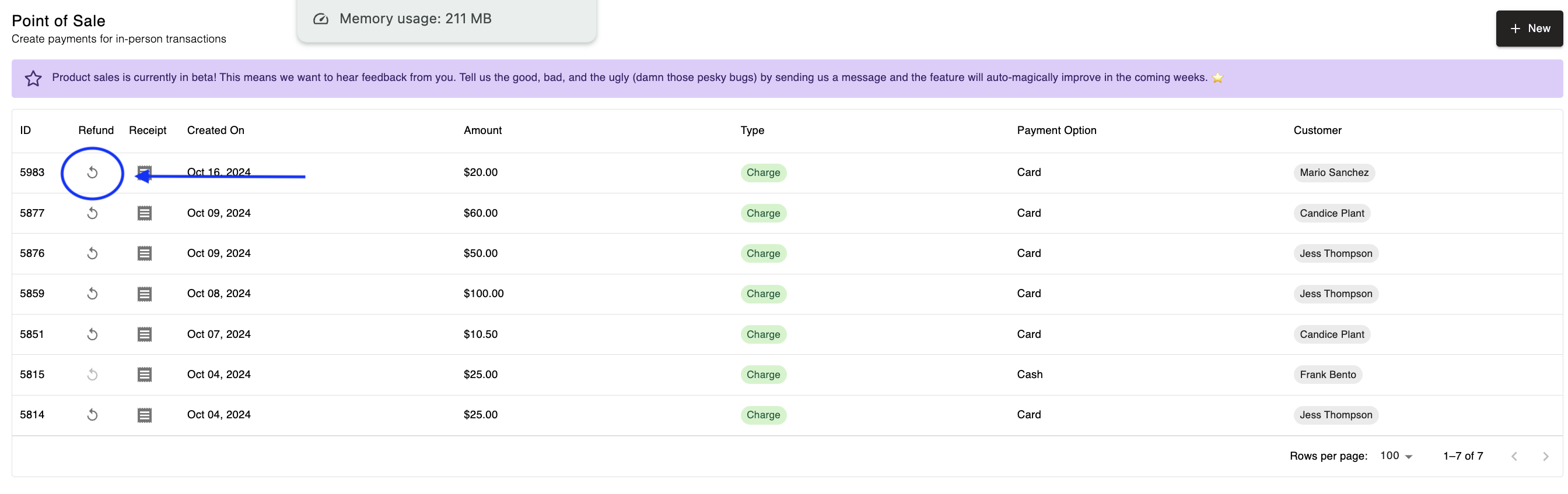 - Find the transaction you wish to refund and click the Refund button.