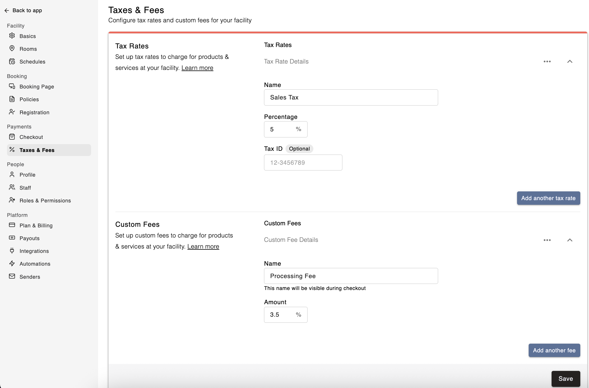 You can add custom fees to services or products at your facility, such as processing fees, technology fees, or any other fees that is payable by customers.