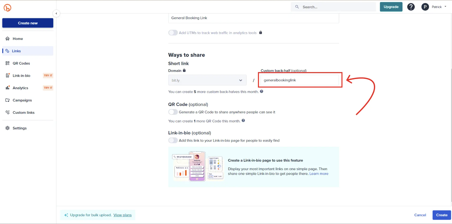 If you wish, you can add a custom back-half to your shortened link. We recommend that if you choose to use it, you use it for service descriptions or something similar. Just a heads up, with the free version of Bit.ly, you can only create 5 back-halves per month.