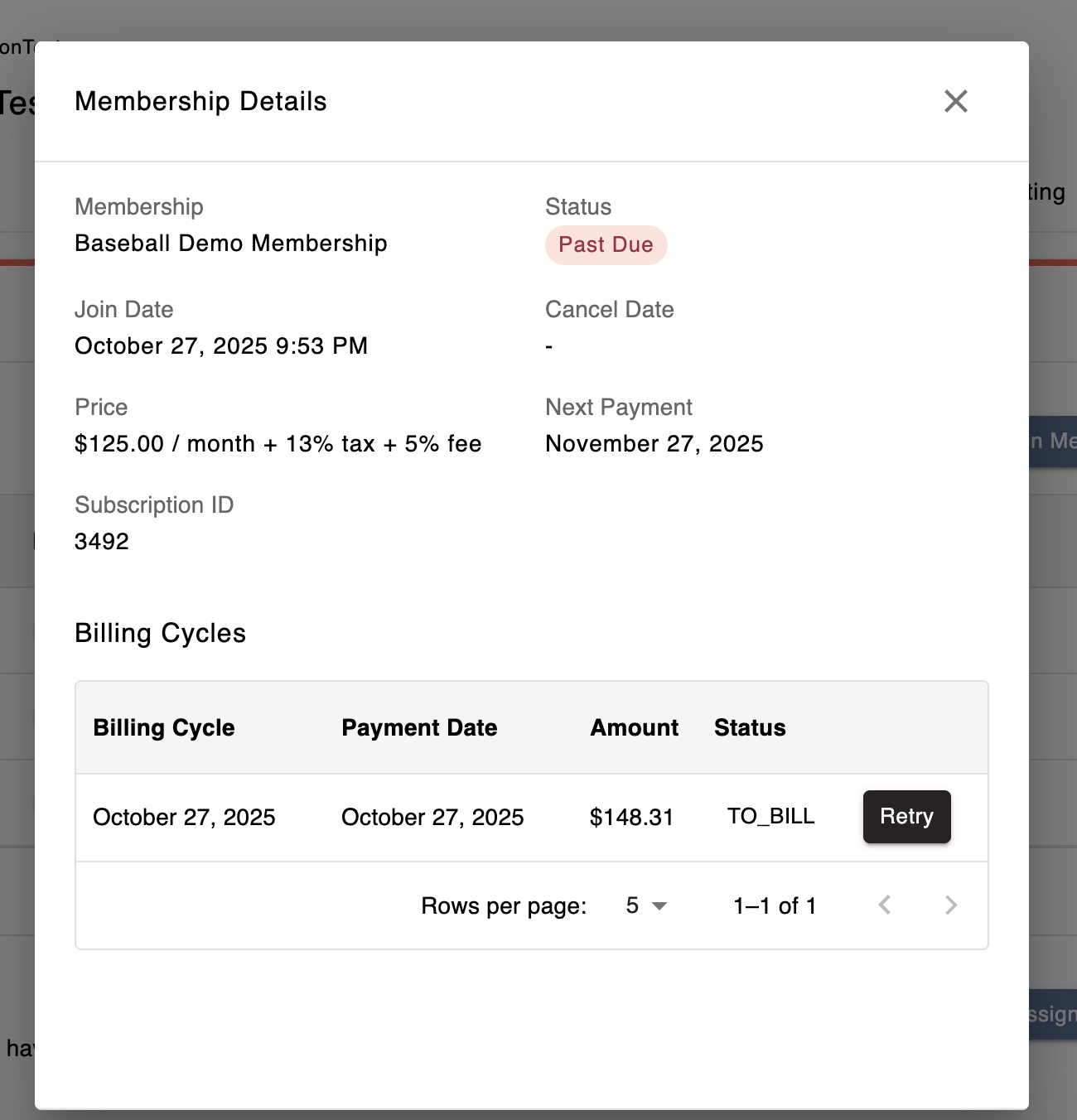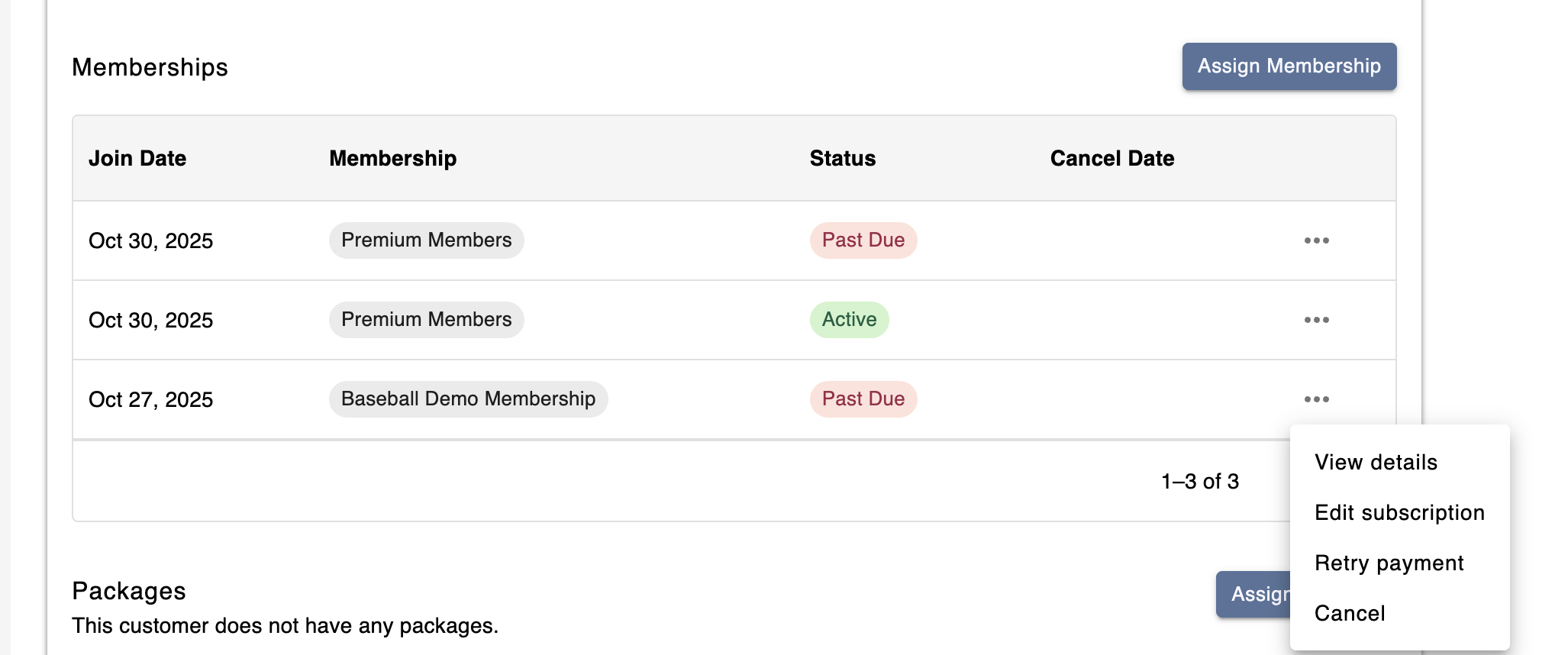 - Click on the More (three dots) button next to the membership, and select Retry Payment