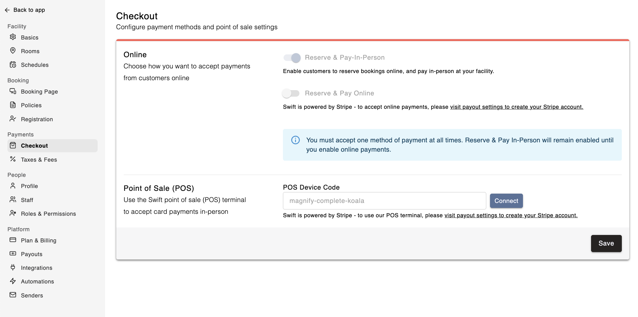 - Reserve and Pay In-Person: Allow customers to make bookings on your page, and not pay for it at the time of booking. The booking will show up in the Calendar, marked as unpaid. You'll then be required to collect and process payment for their booking when they walk-in, or off platform.