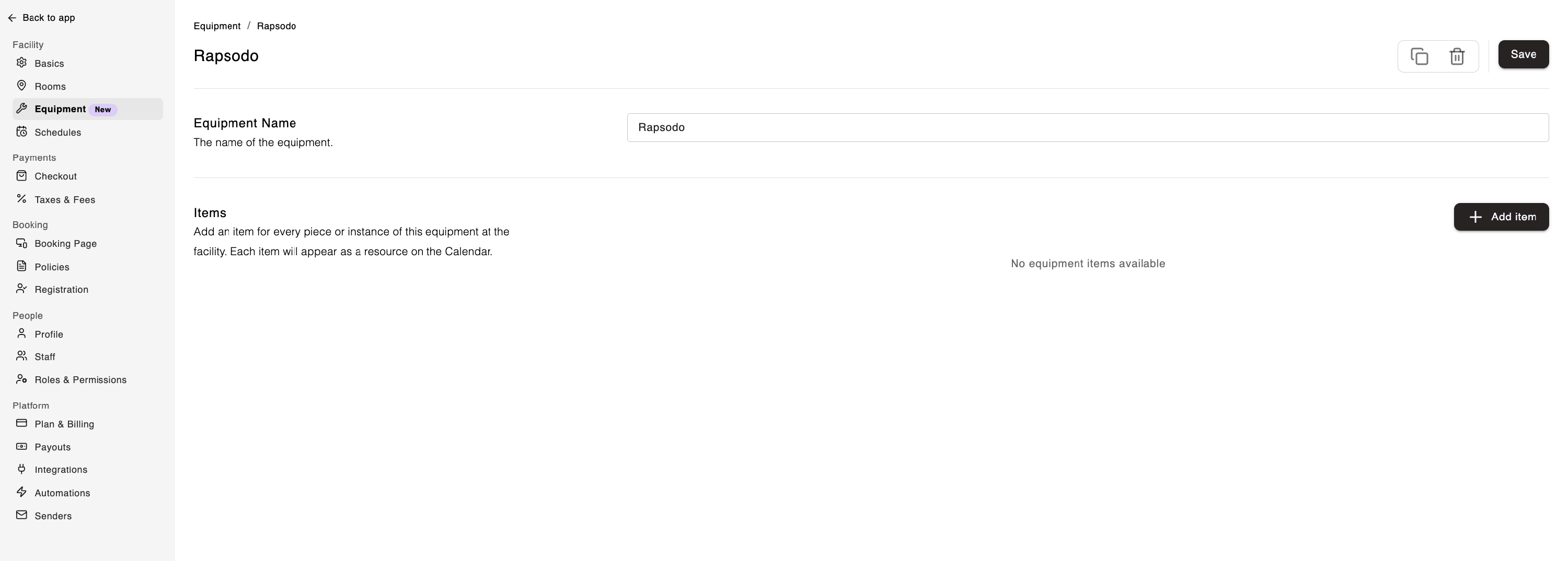 Repeat this for each piece of equipment under the category. For example, if you have 3 Rapsodo machines, create 3 items: Rapsodo #1, Rapsodo #2, and Rapsodo #3.
