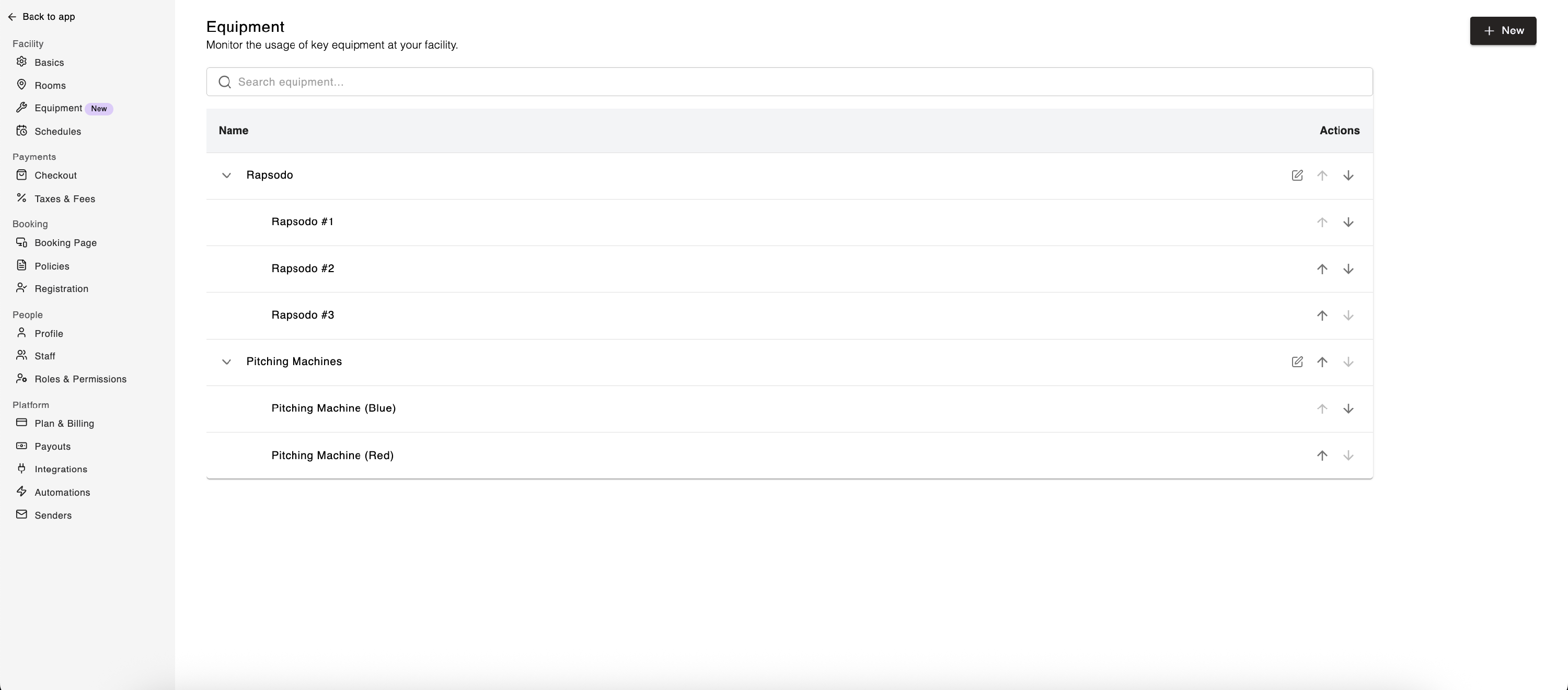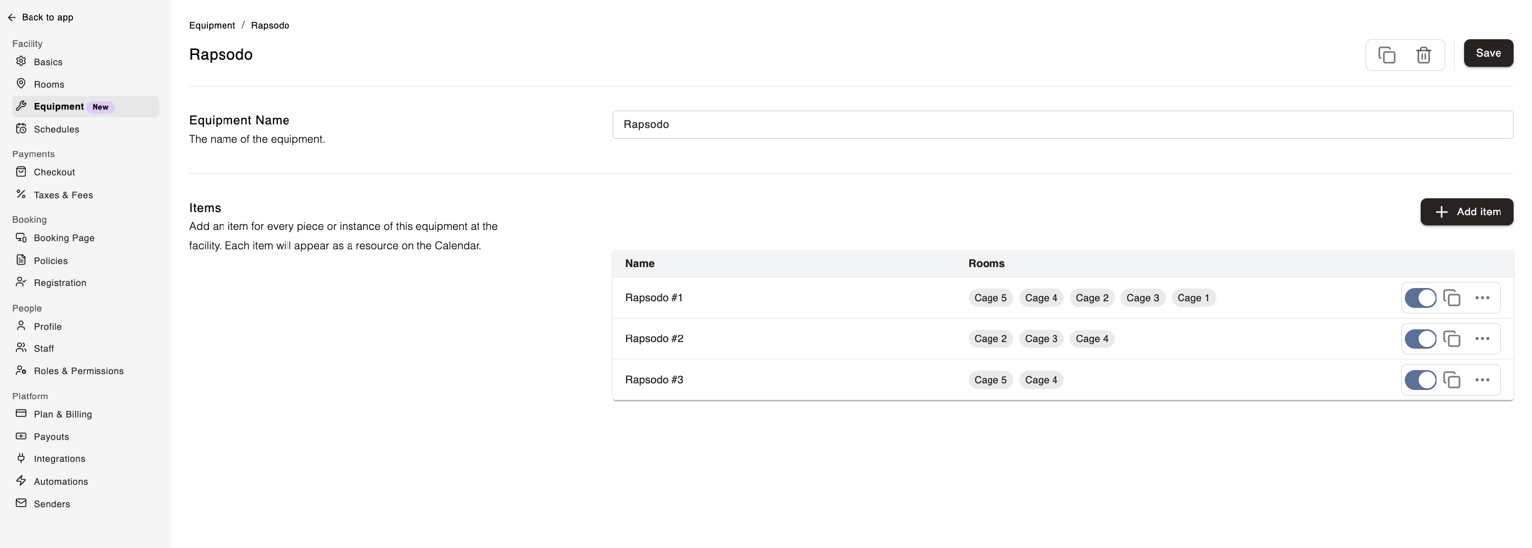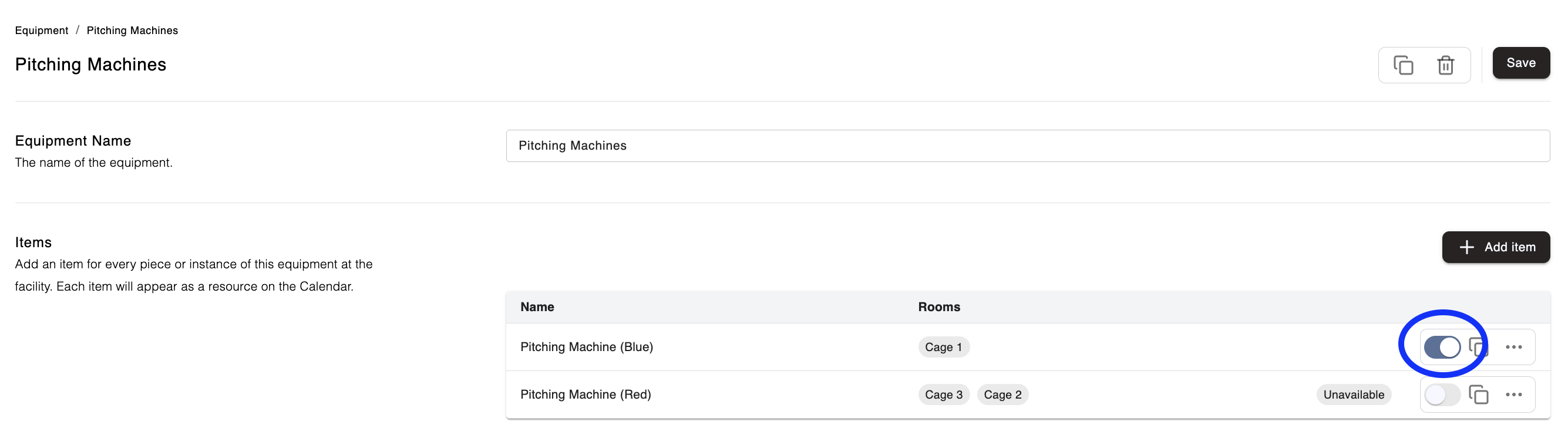 Equipment Management helps facilities keep track of equipment that is limited in quantity and can be moved between rooms, such as pitching machines, Rapsodo devices, and other specialty items. It ensures your equipment is available when needed and is automatically marked as booked or in use when assigned to a rental.