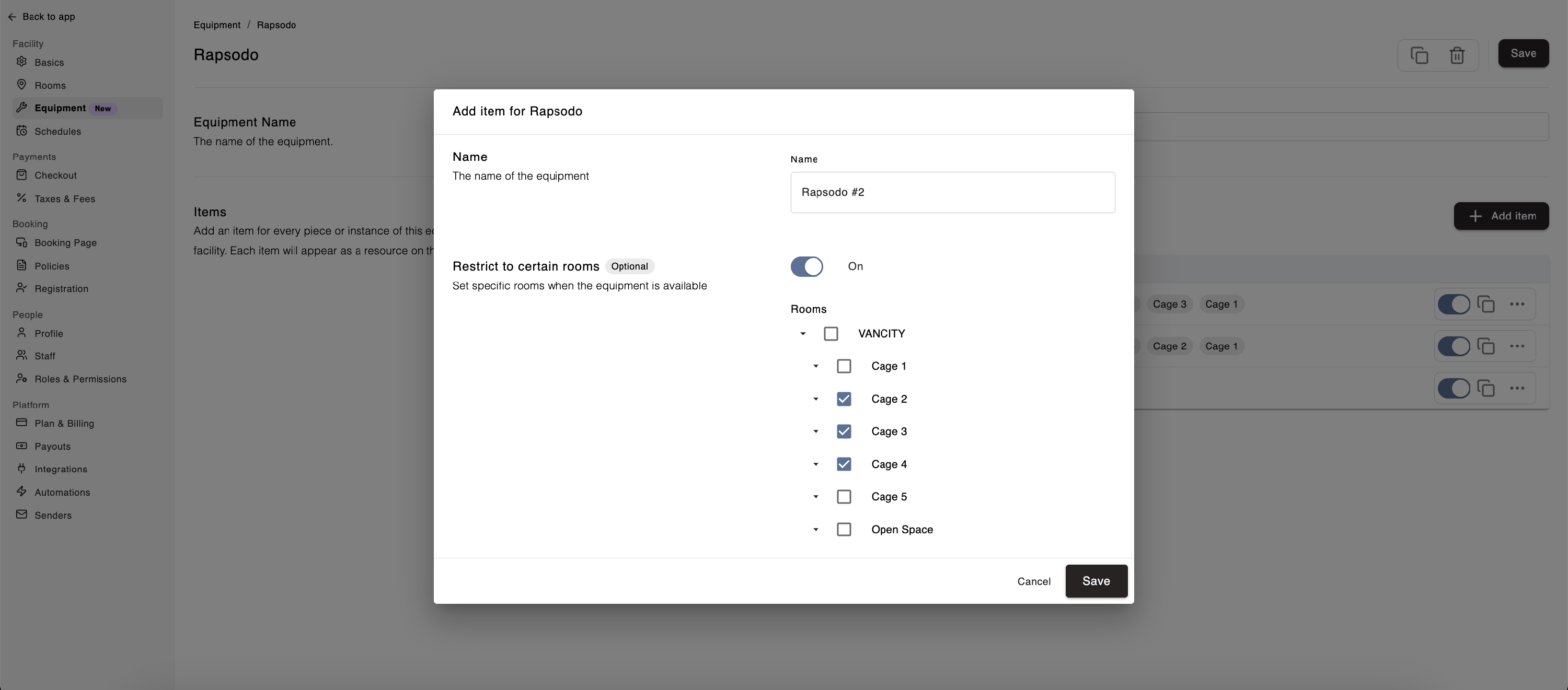 For example, in the screenshot above, Rapsodo #3 is restricted to Cage 4 and Cage 5 only. However, if staff were to create a manual booking in Admin, they can book Rapsodo #3 in Cage 1 as long as both the equipment and room are available.